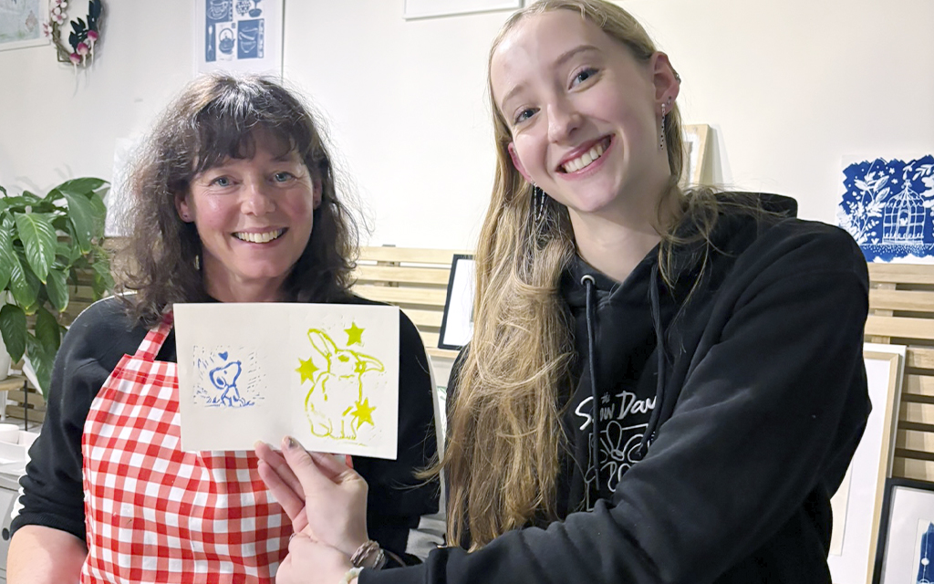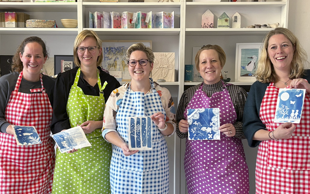 - een unieke print (monoprint, cyanotype of linoprint) in een mooie kaart (voor een zelf te kiezen geldbedrag tot 50 euro)